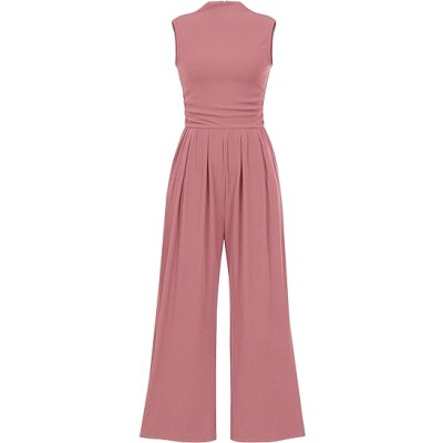 Womens Summer Jumpsuits Dressy Casual One Piece Outfits Sleeveless Mock Neck Wide Leg Pants Rompers with Pockets
