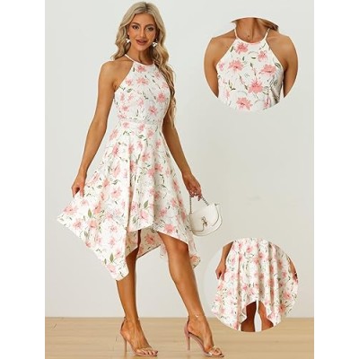 Halter Neck Sleeveless Dresses for Women's Irregular Hem Floral Dress
