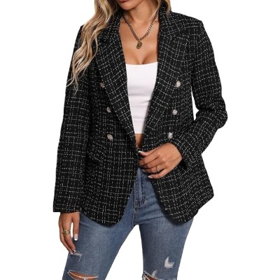Women's Oversized Double-Breasted Suit Blazer Jacket Top Stitch Long Sleeve Casual Work Office Blazer with Pockets
