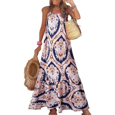 Women Summer Dresses 2024 Spaghetti Strap Scoop Neck Smocked Ruffle Flowy Boho Maxi Dress