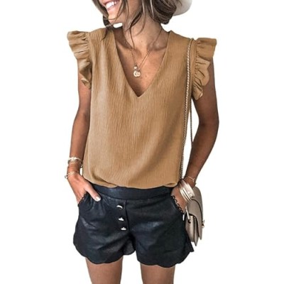 Womens 2024 Cute V Neck Ruffle Sleeveless Shirts Elegant Tank Tops Blouses