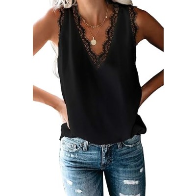 Women Lace Trim Tank Tops V Neck Fashion Casual Sleeveless Blouse Vest Shirts