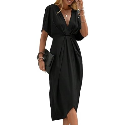 Women's Plunge Deep V Neck Short Sleeve Summer Pleated Wrap Tunic Midi Dress