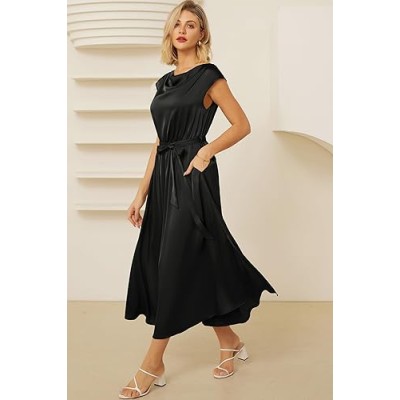 Women's 2024 Satin Midi Dress Summer Cap Sleeve Cowl Neck Belted Slit Elegant A-Line Flowy Dress with Pockets