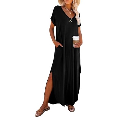 Women's Summer Casual Loose Short Sleeve Long T Shirt Dress Split Maxi Beach Sundress Travel Vacation Outfits