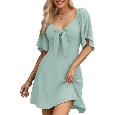 Womens 2024 Summer Ruffle Flowy Swing Short Dress V Neck A Line 3/4 Sleeve Tie Waist Dresses