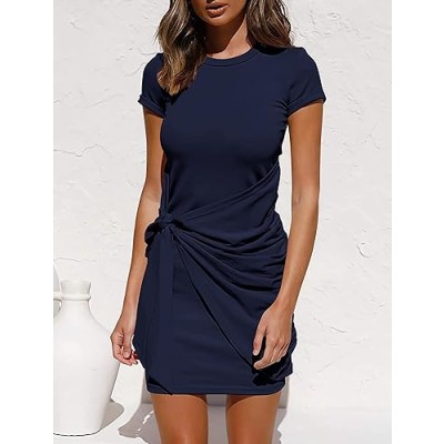 Women 2024 Spring Casual Short Sleeve Ruched Bodycon Tank T Shirt Dress Tie Waist Sun Beach Summer Mini Dresses